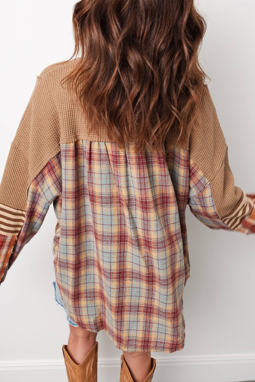 Waffle Stripe Plaid Patchwork Henley Knit Top