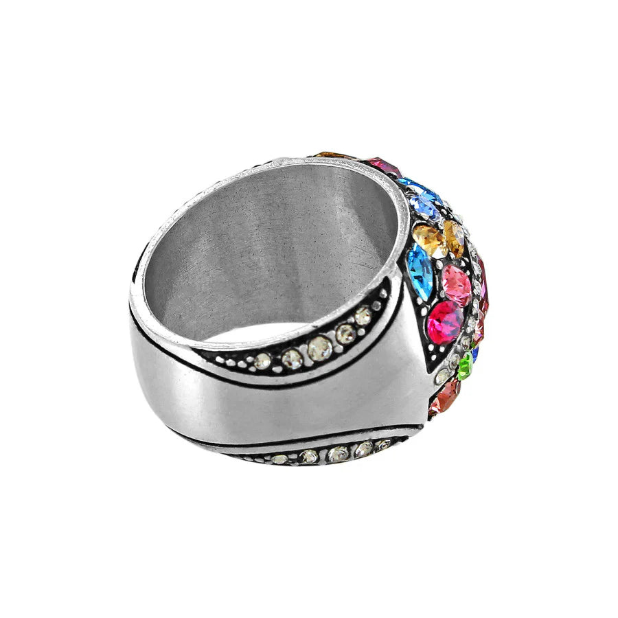 Brilliant fine quality gemstones make a statement, masterfully fitted to create a colorful puzzle that adorns this statement ring.