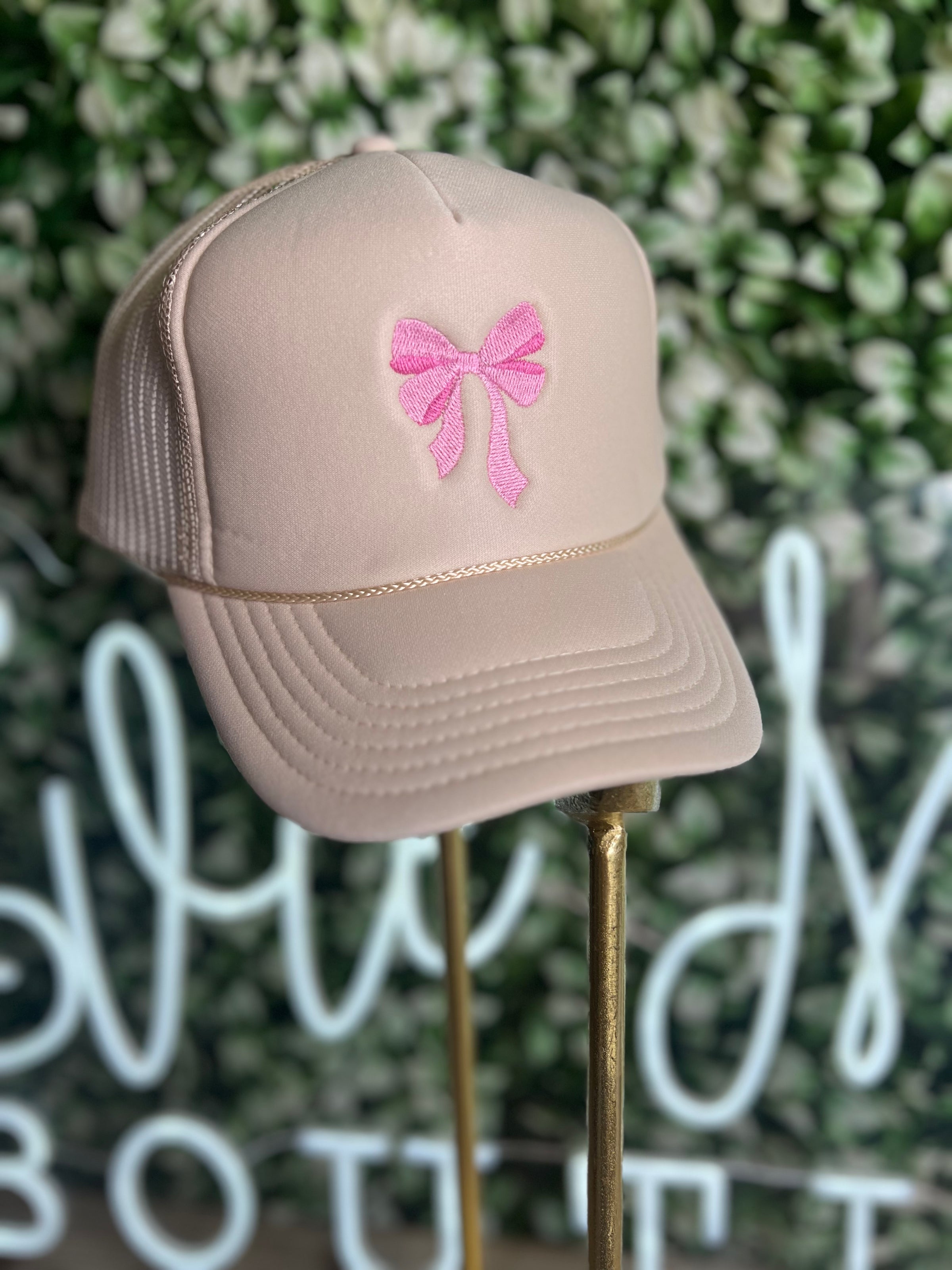 Embroidered Pink Bow on Tan Trucker Cap