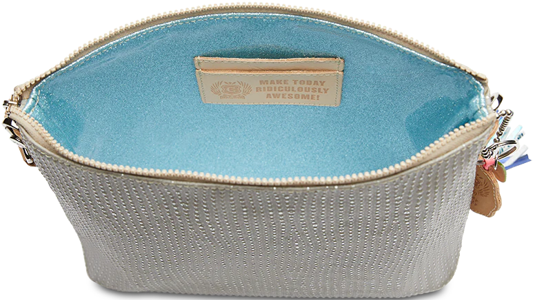 - Includes detachable and adjustable woven crossbody strap