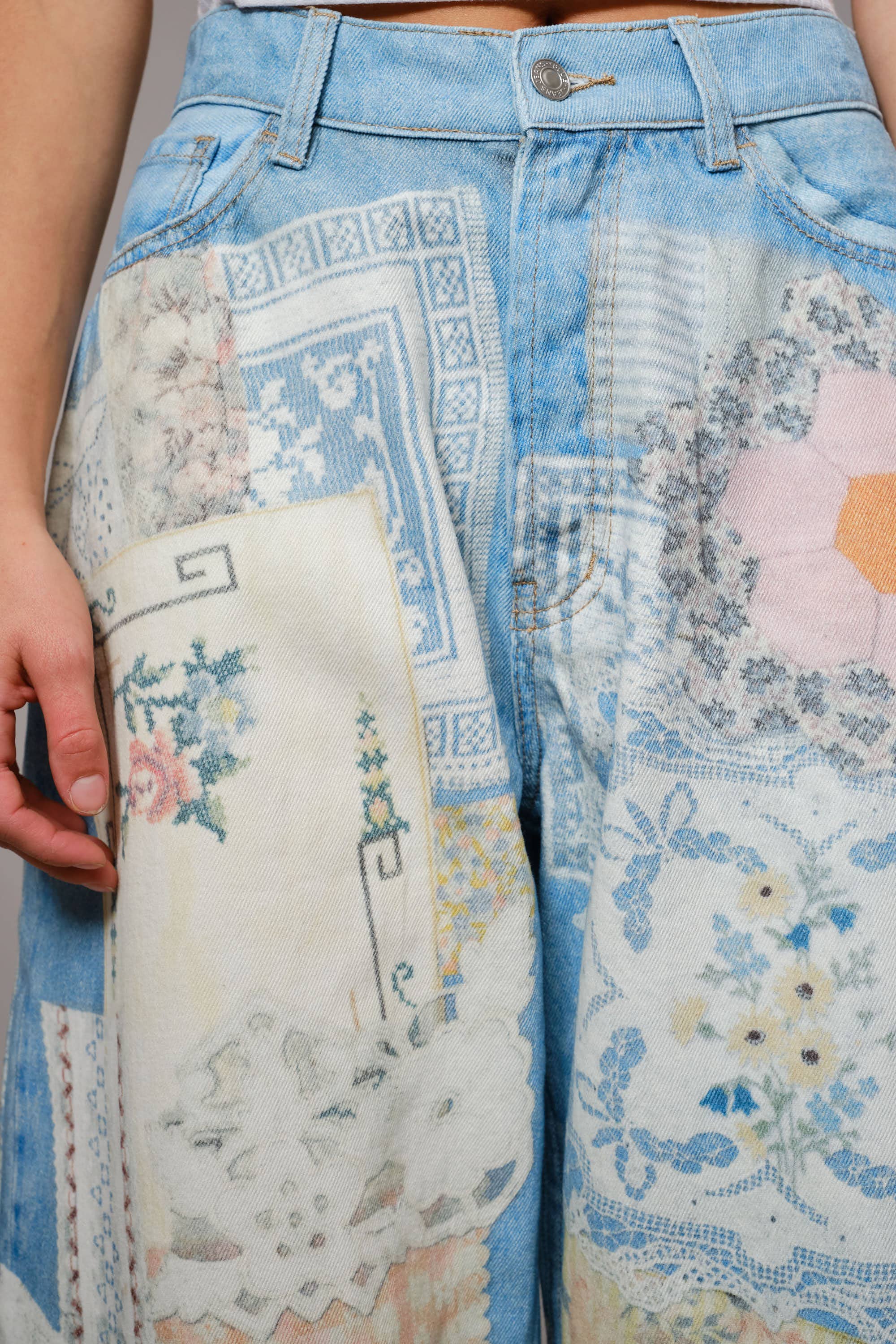 High-rise denim jeans with a relaxed barrel leg silhouette, featuring an allover vintage-inspired patch print with florals, lace, and needlework motifs. Classic five-pocket styling with a button fly and belt loops.
