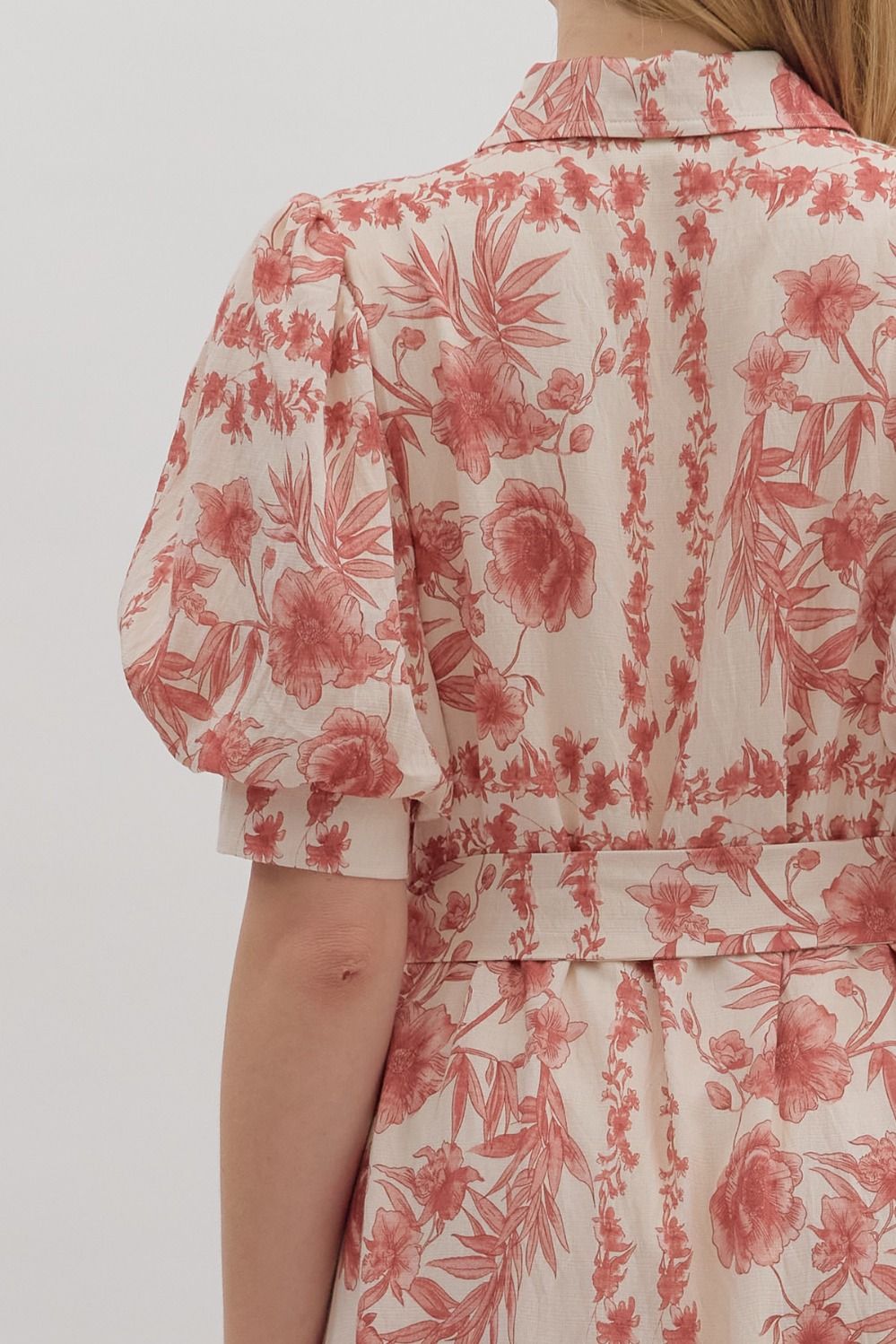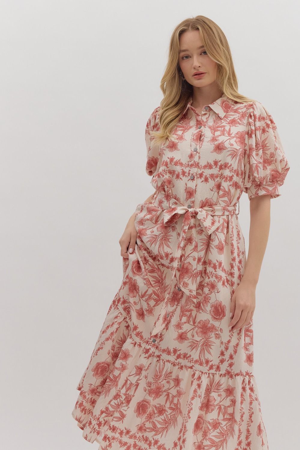 Floral print short puff sleeve midi dress featuring tiered skirt, shirt collar, and self-tie belt at waist. Side pockets. Button-front closure. Lined. Woven. Non-sheer. Lightweight.