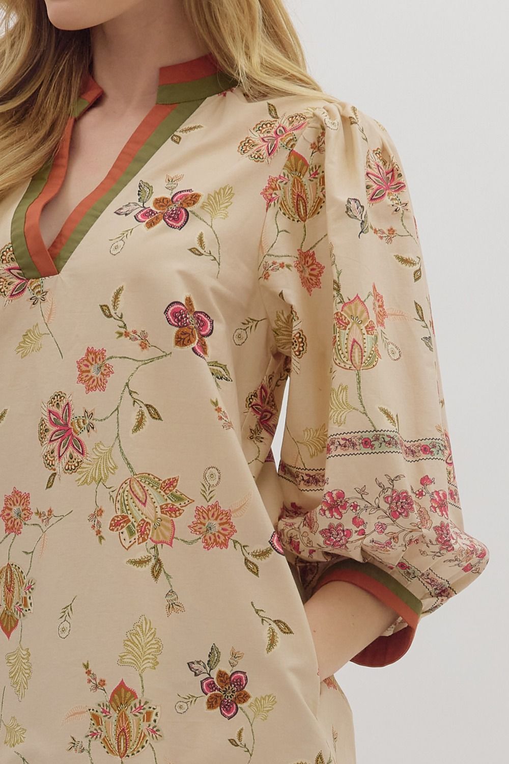 Ecru Botanical 3/4 Puff Sleeve Mini Dress