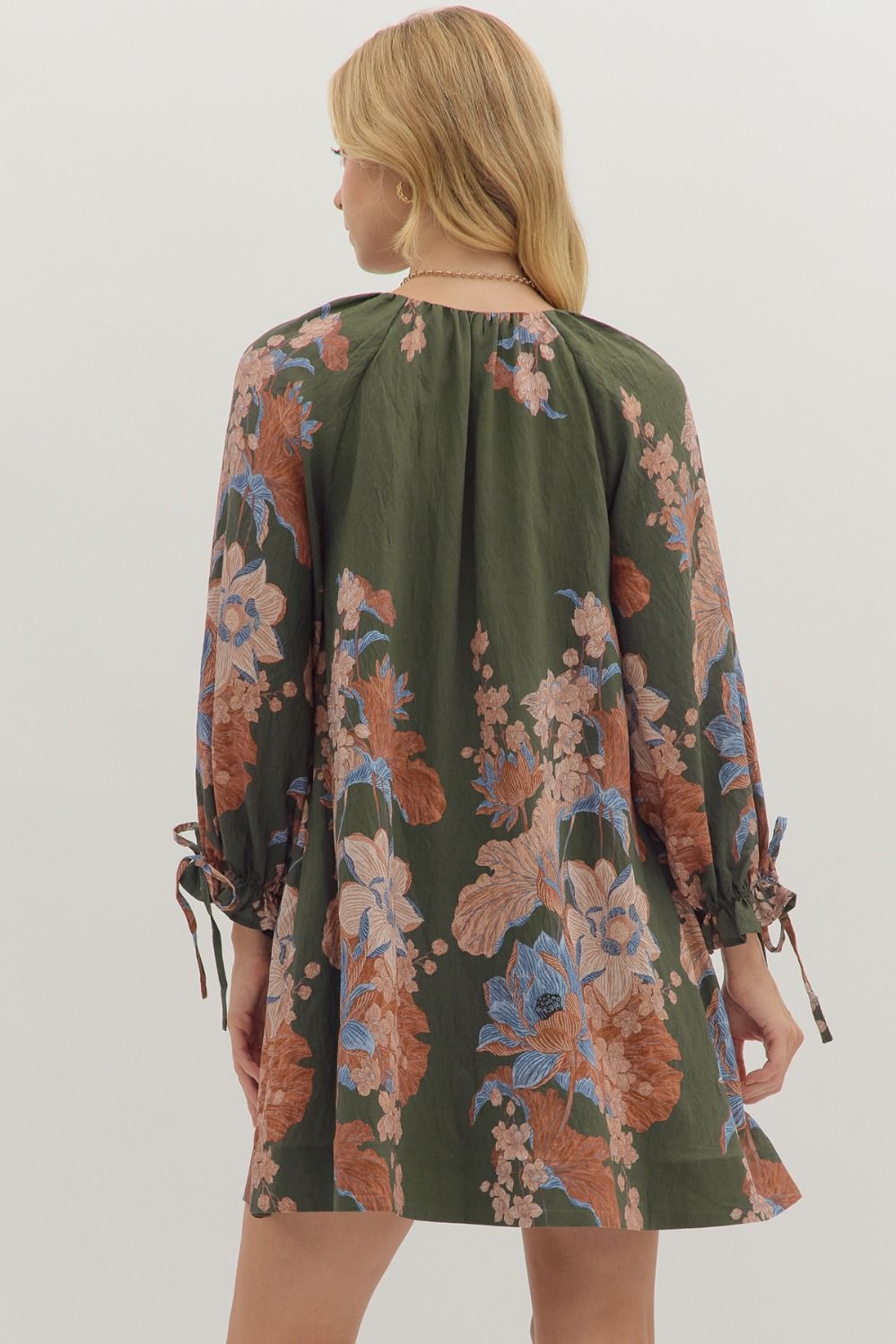Floral print long sleeve mini dress featuring V-neck with gathered detail. Tie closure at cuffs. Side pockets. Lined. Woven. Non-sheer. Lightweight.