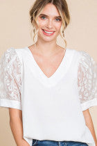 Solid top with a V-neck, short puffed sleeves, leopard organza fabric and band cuffs.