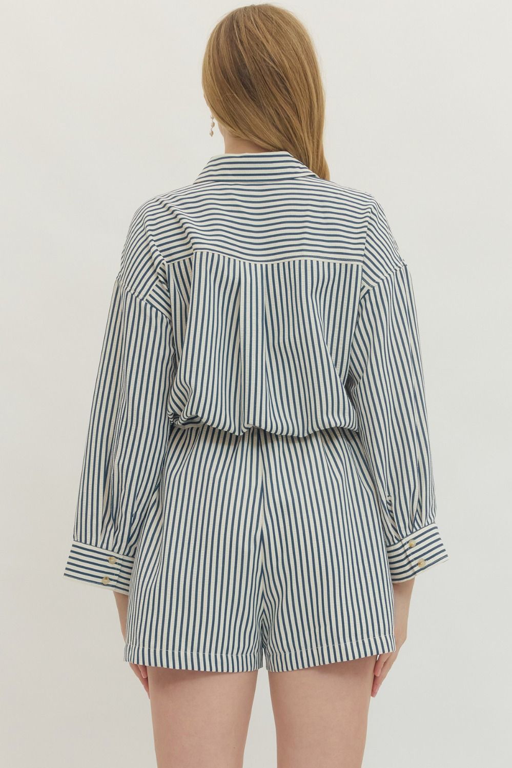 Striped long sleeve shorts romper featuring adjustable drawstring waist. Button closure at front. Side pockets. Lined. Woven. Non-sheer. Lightweight.