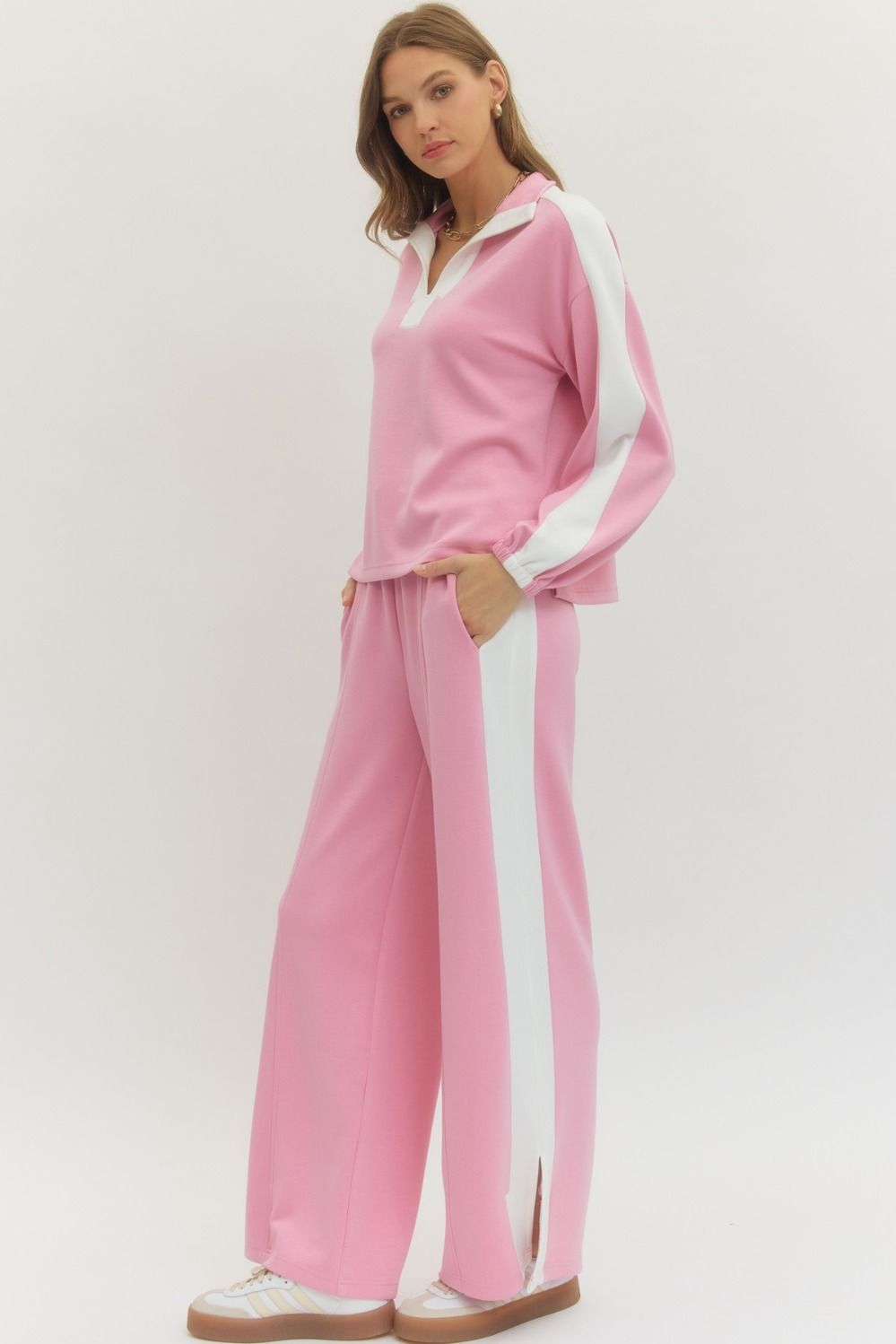 Solid long sleeve knit top featuring contrast collar and contrast stripe detail at sleeves. Side slits at hem. Elasticated sleeve openings. Unlined. Knit. Non-sheer. Lightweight.