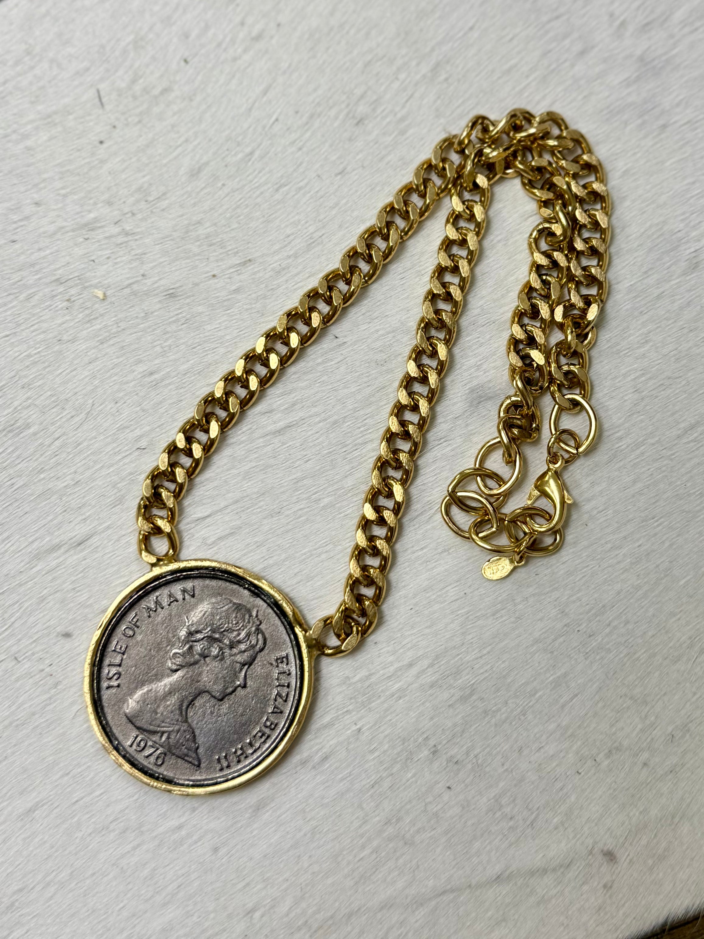 Unique 16" chain with 2" extender, with Elizabeth coin pendant measuring approximately 1.75". Handmade in New York.