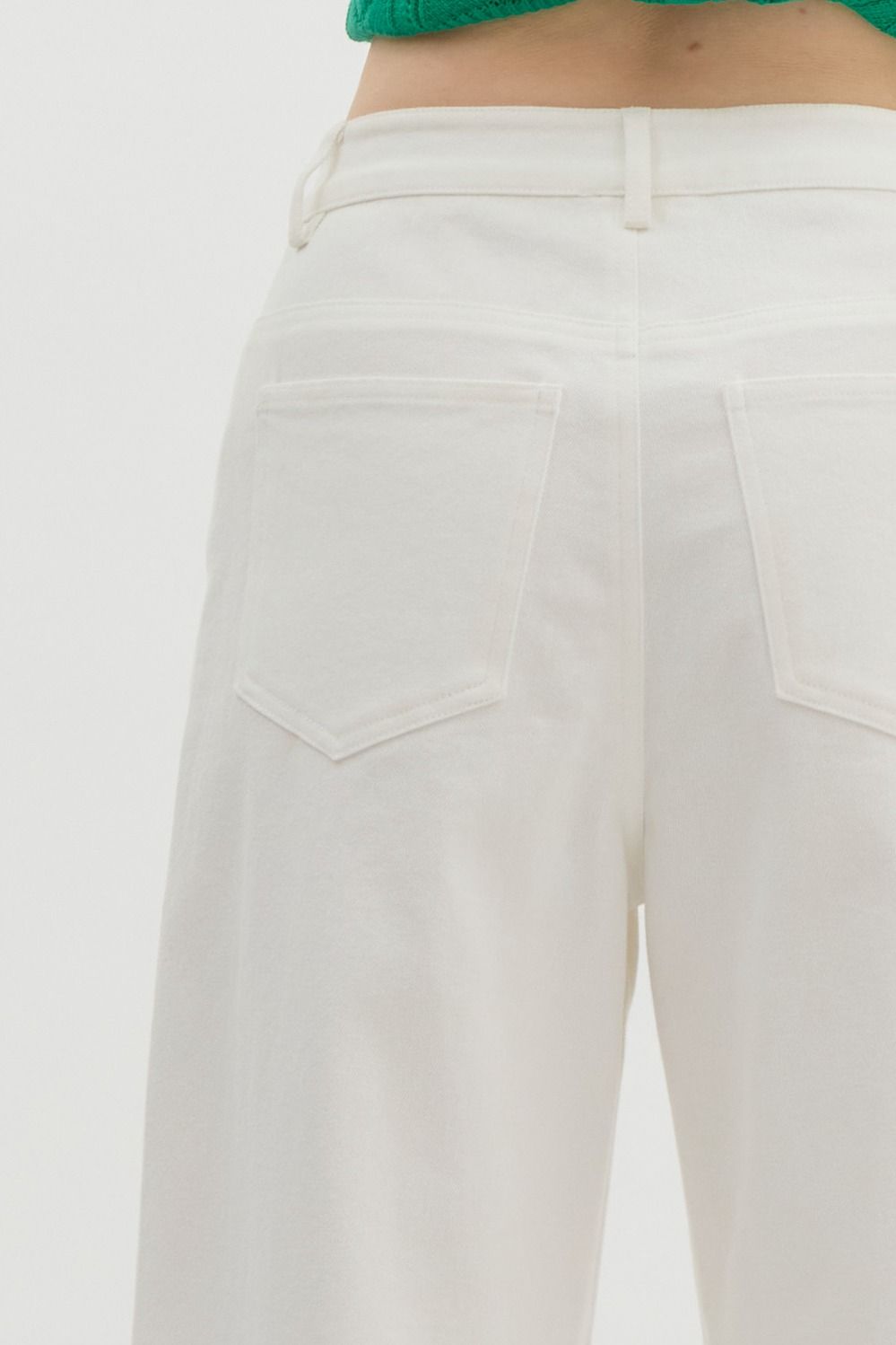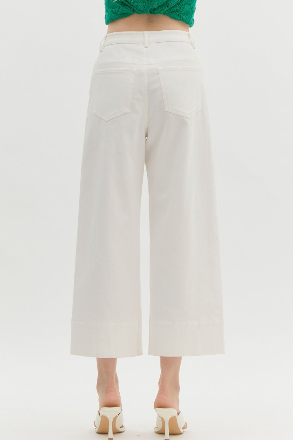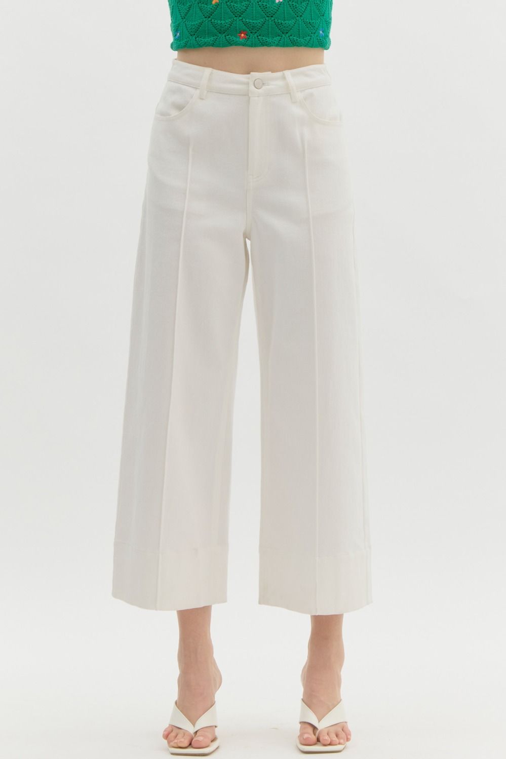 Made by Entro. Solid mid rise zip fly and button closure wide leg cuff ankle length pants. Front and back pockets. Unlined. Woven. Non-sheer. Lightweight.