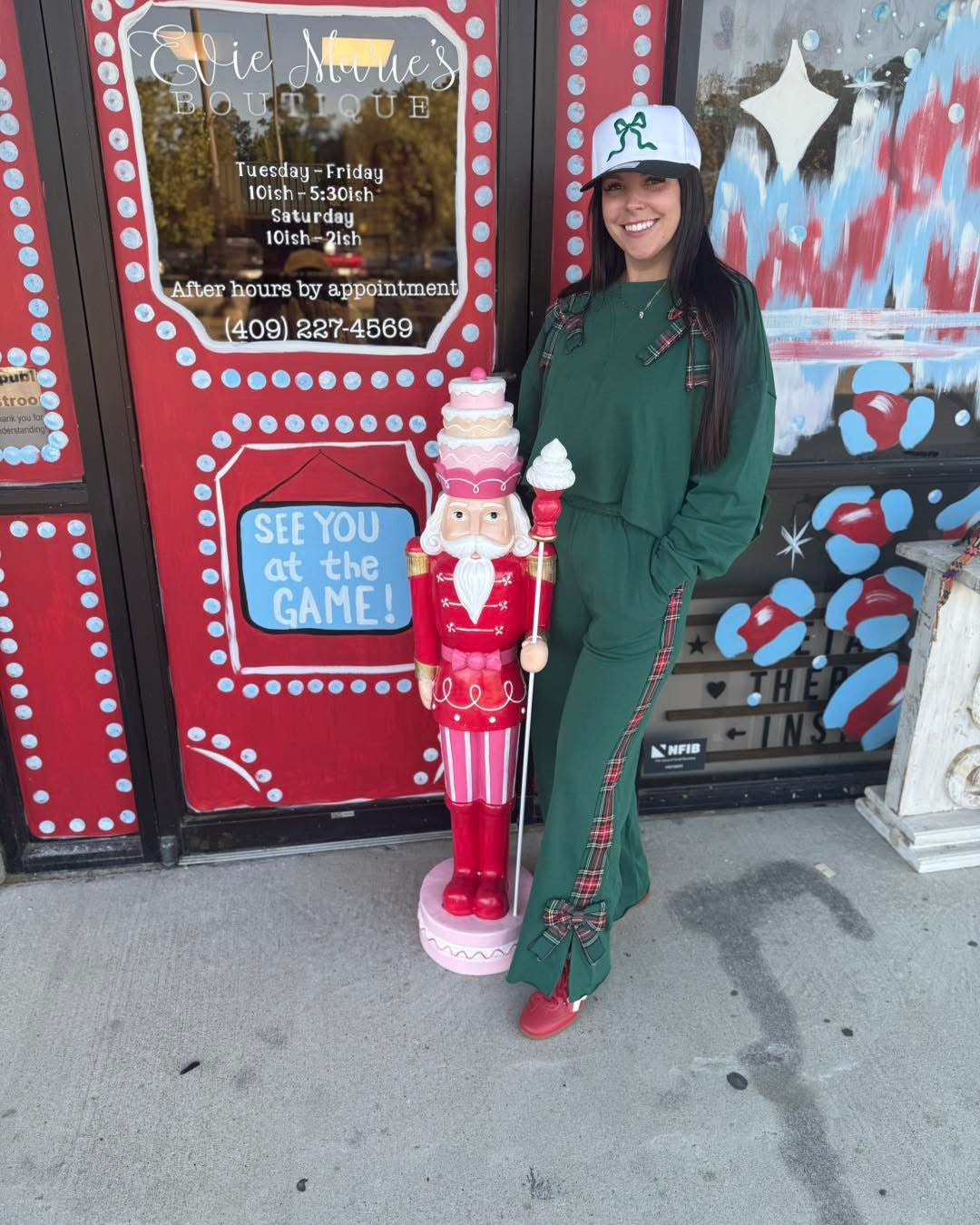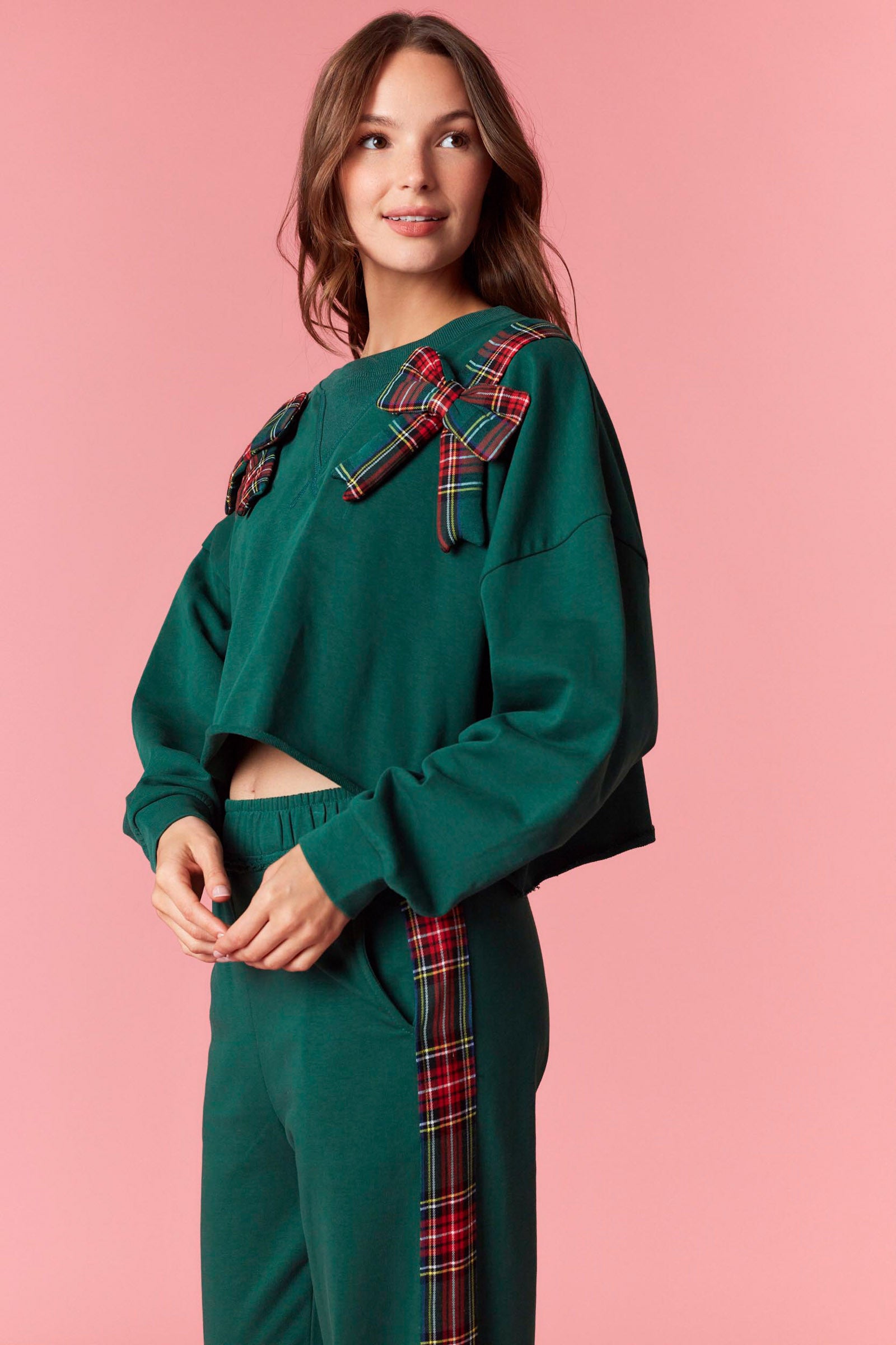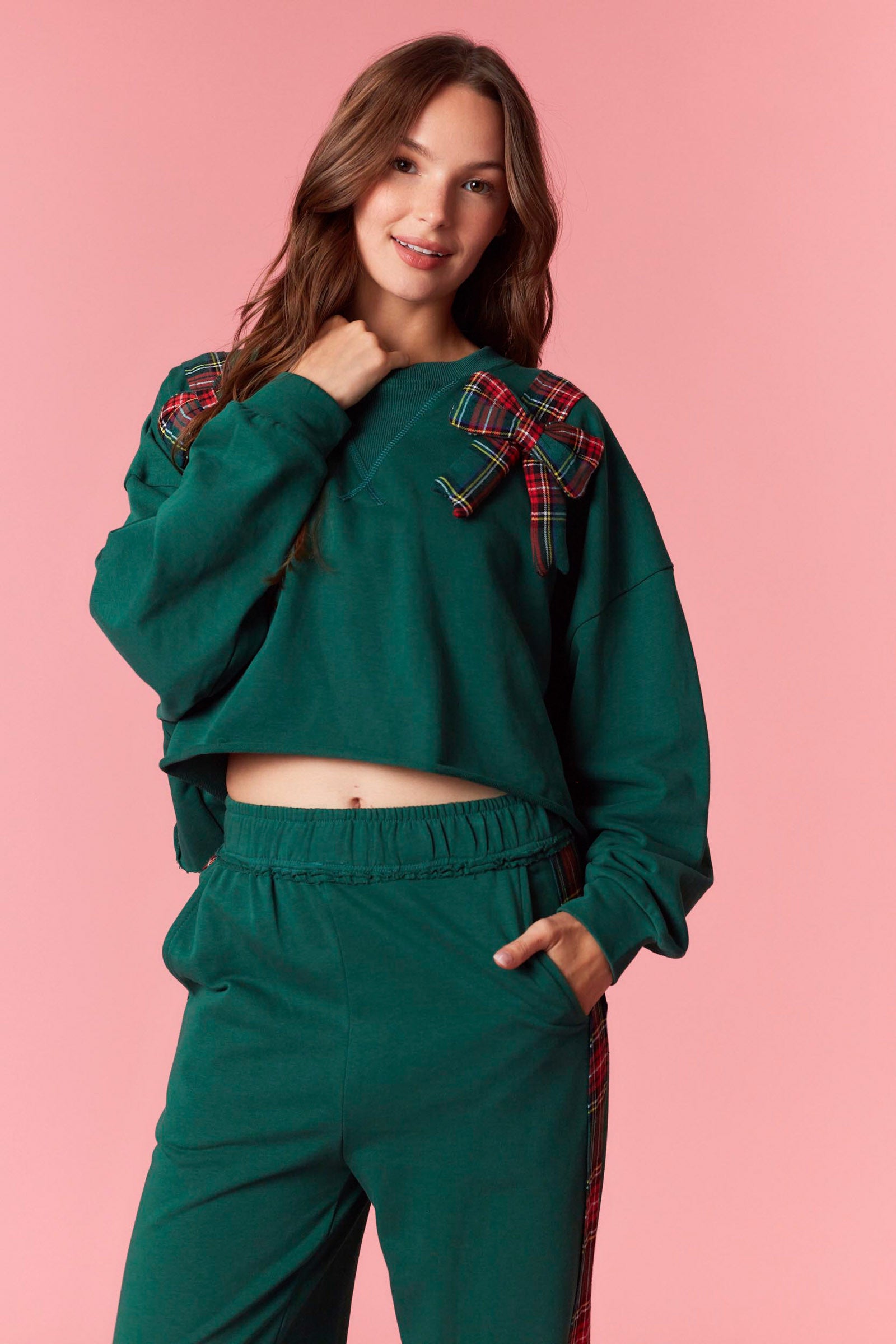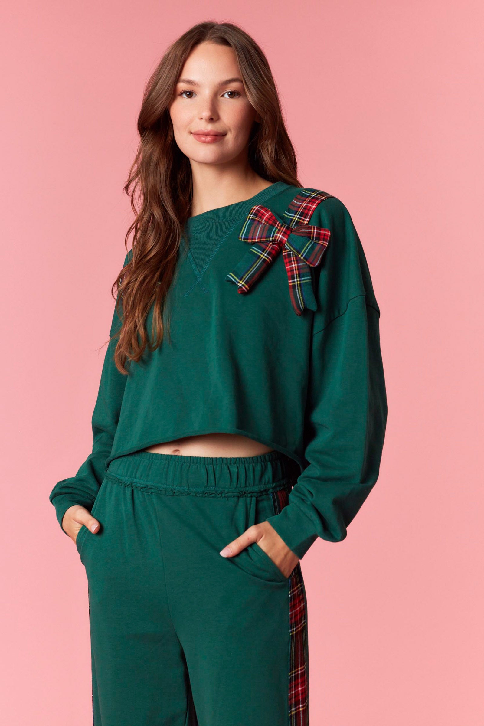 Round neck with long sleeves in hunter green and plaid bow. Matching bottoms available in limited quantities.