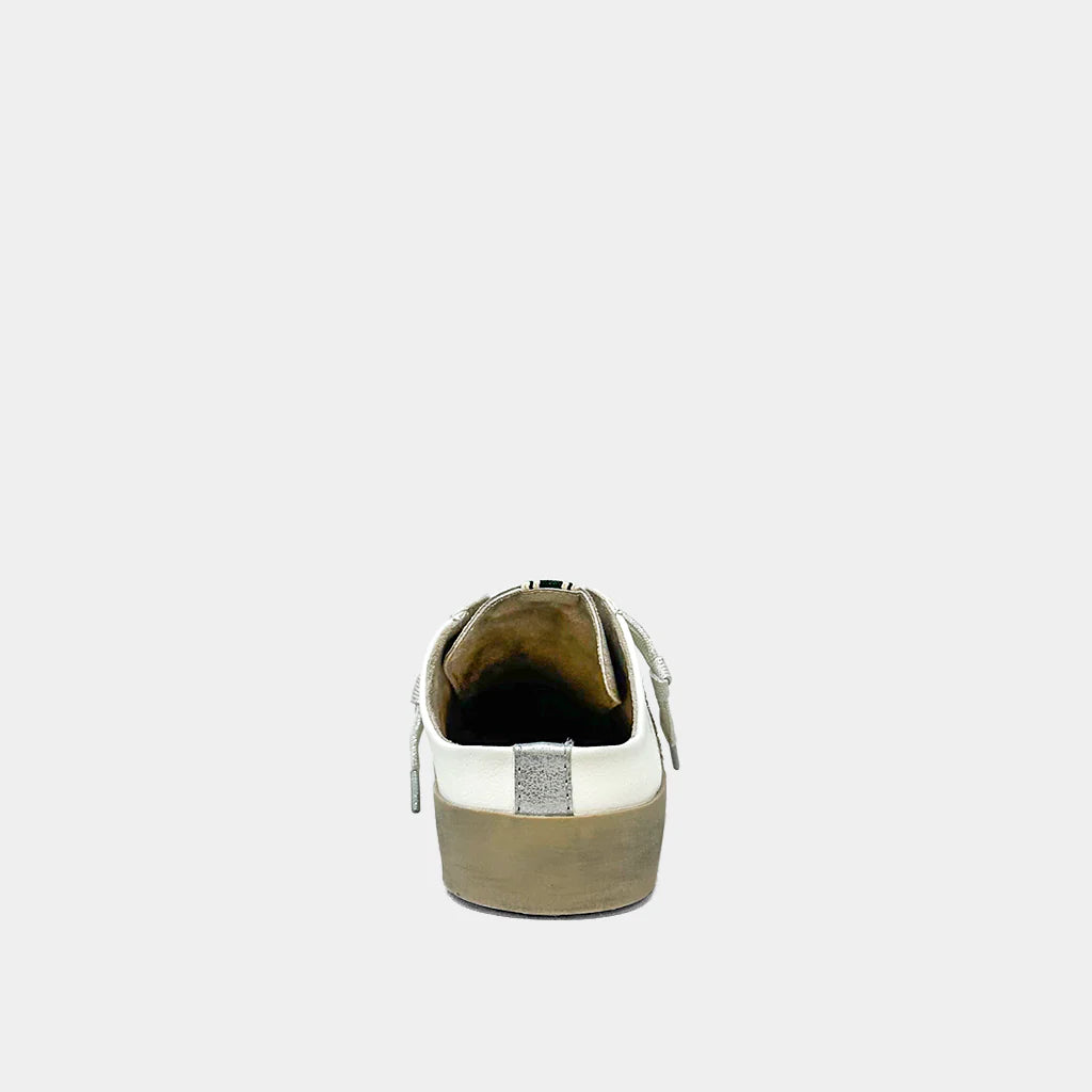 Slip into effortless style with the POLKA in Champagne Glitter, blending retro-inspired sneakers with laid-back comfort. Featuring a sleek open-back design and a faux leather upper, this pair is elevated by a glittering champagne star that adds a touch of glamour. The beige suede tongue provides a soft, luxurious feel, while the cushioned sole ensures all-day comfort. POLKA is your go-to for slipping on and sparkling out in style, perfect for those always on the move.