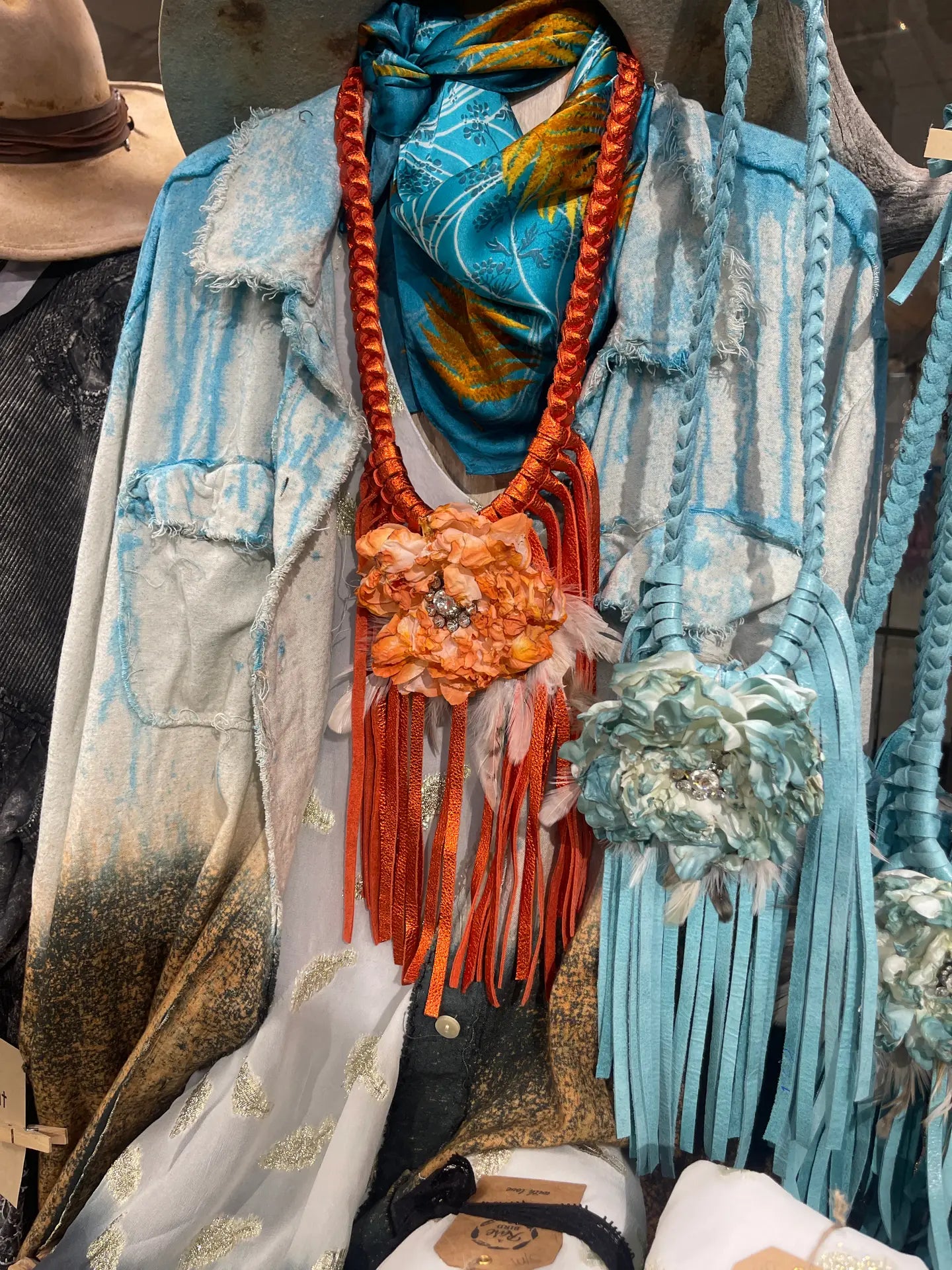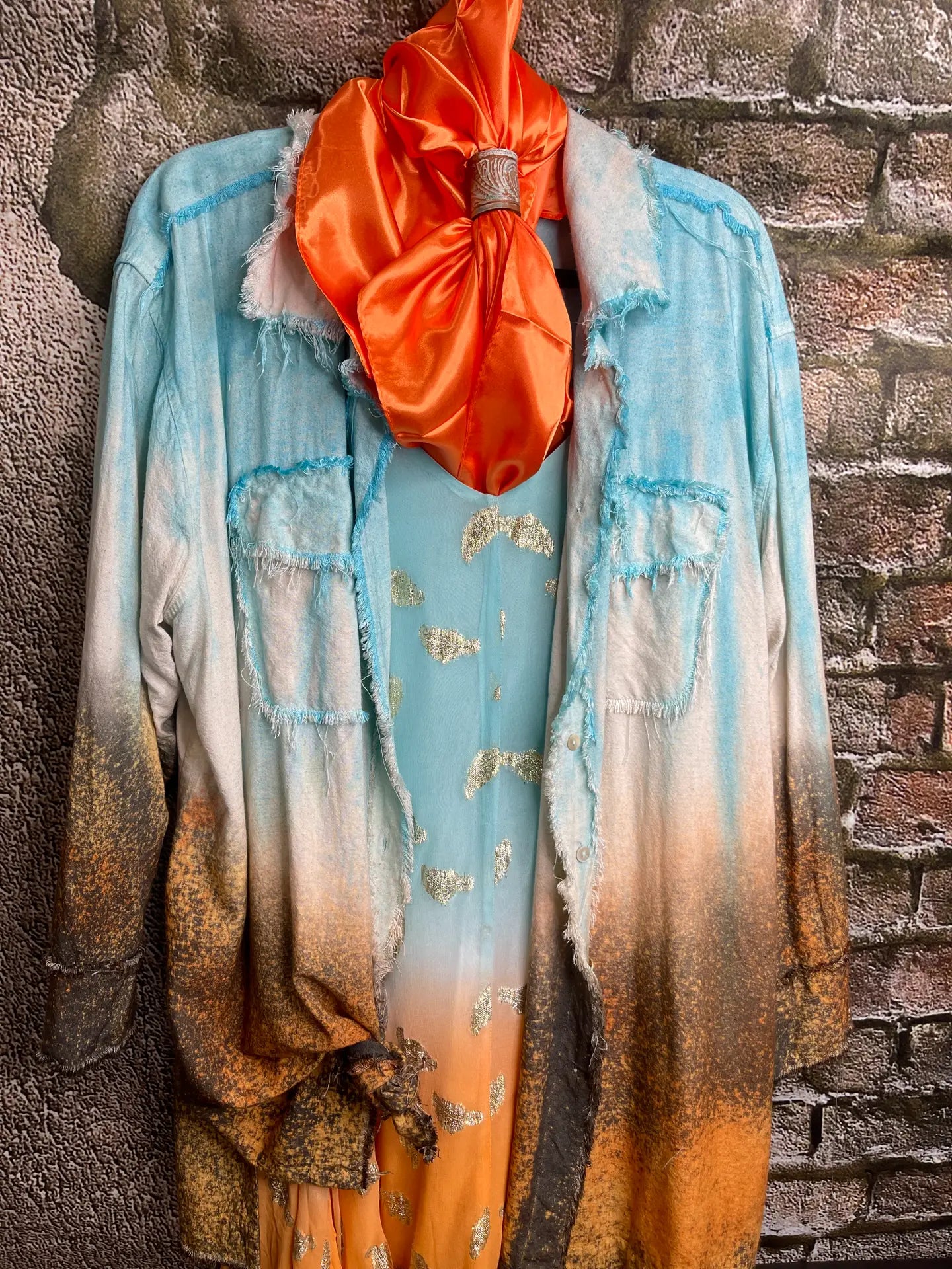 Drips of turquoise and tangerine create an original artwork for ach unique piece. Turquoise cotton linen is distressed and we work our magic! Wear this art with pride! Pairs with so many things...the Vegas tunic and the beautiful turquoise dip dye dress. One size Can be worn as tunic, dress or shacket.