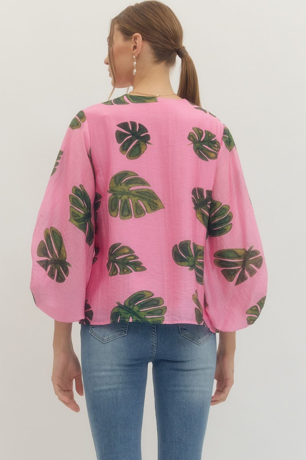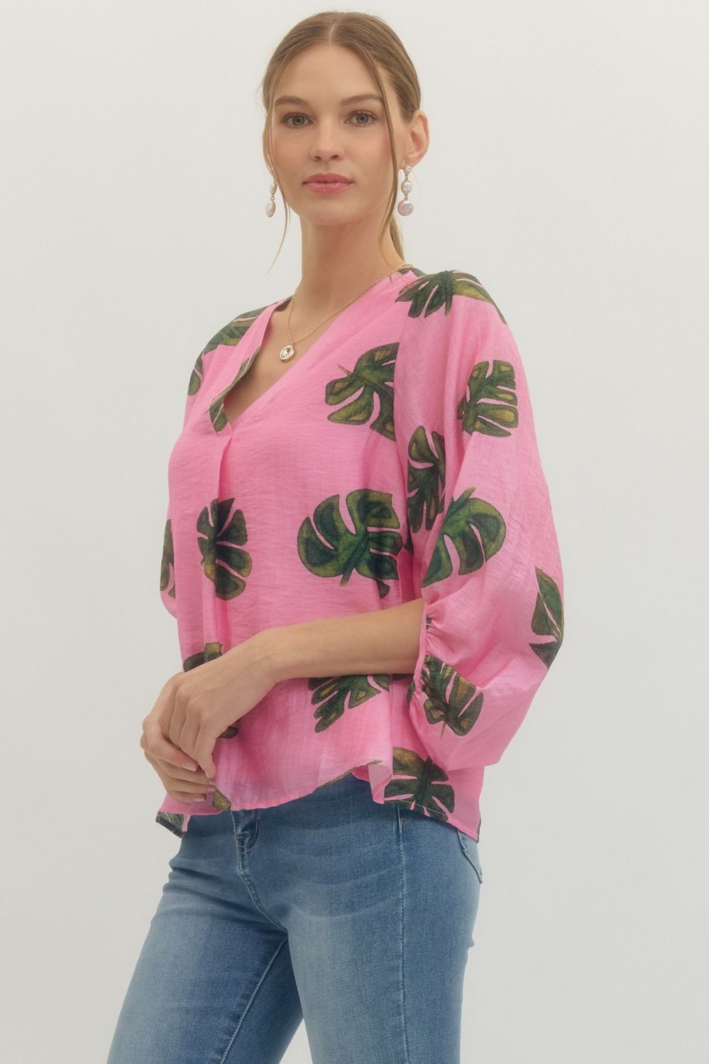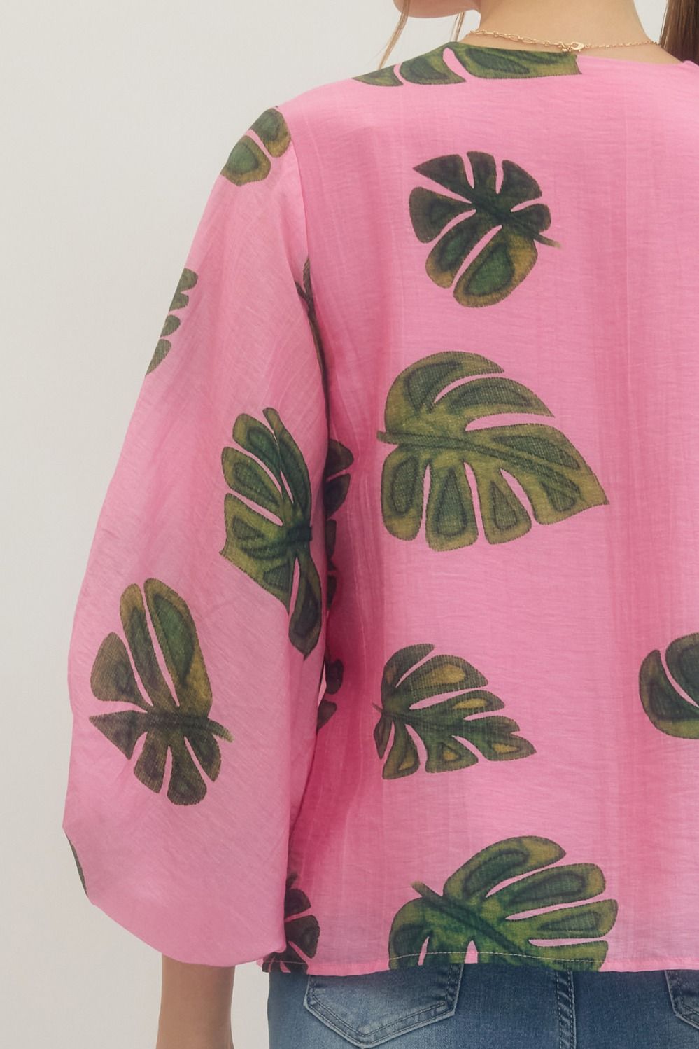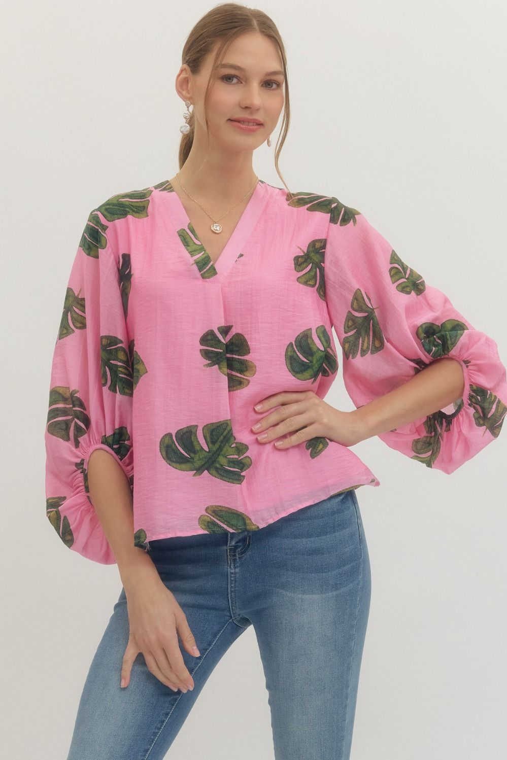Leaf Print Gathered Sleeve Top