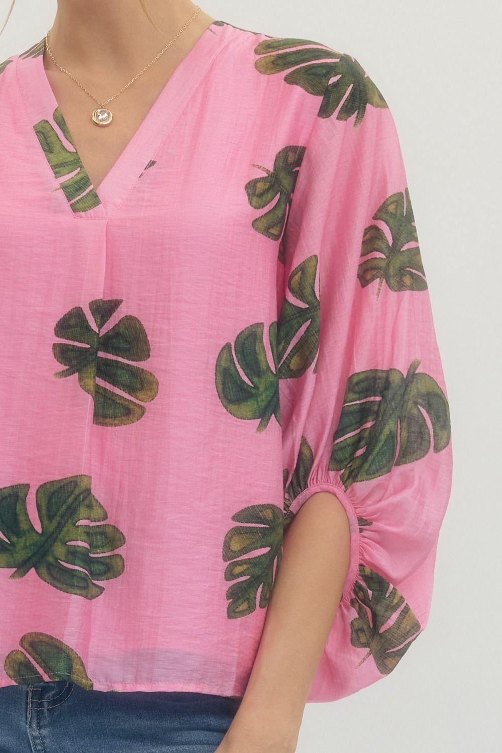 Leaf print sleeve top featuring a V-neckline and gathered sleeve openings without elastic. Lined. Woven. Non-sheer. Lightweight.
