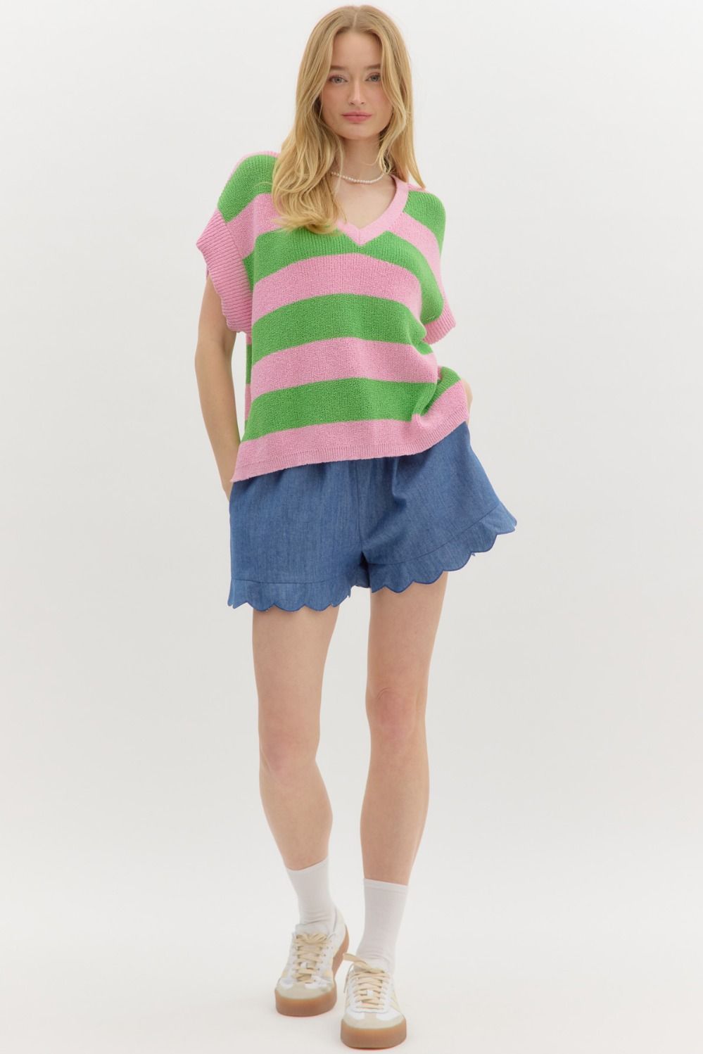 Stripe pattern V-neck oversized sweater knit pullover top featuring slit side hem. Unlined. Knit. Non-sheer. Lightweight.
