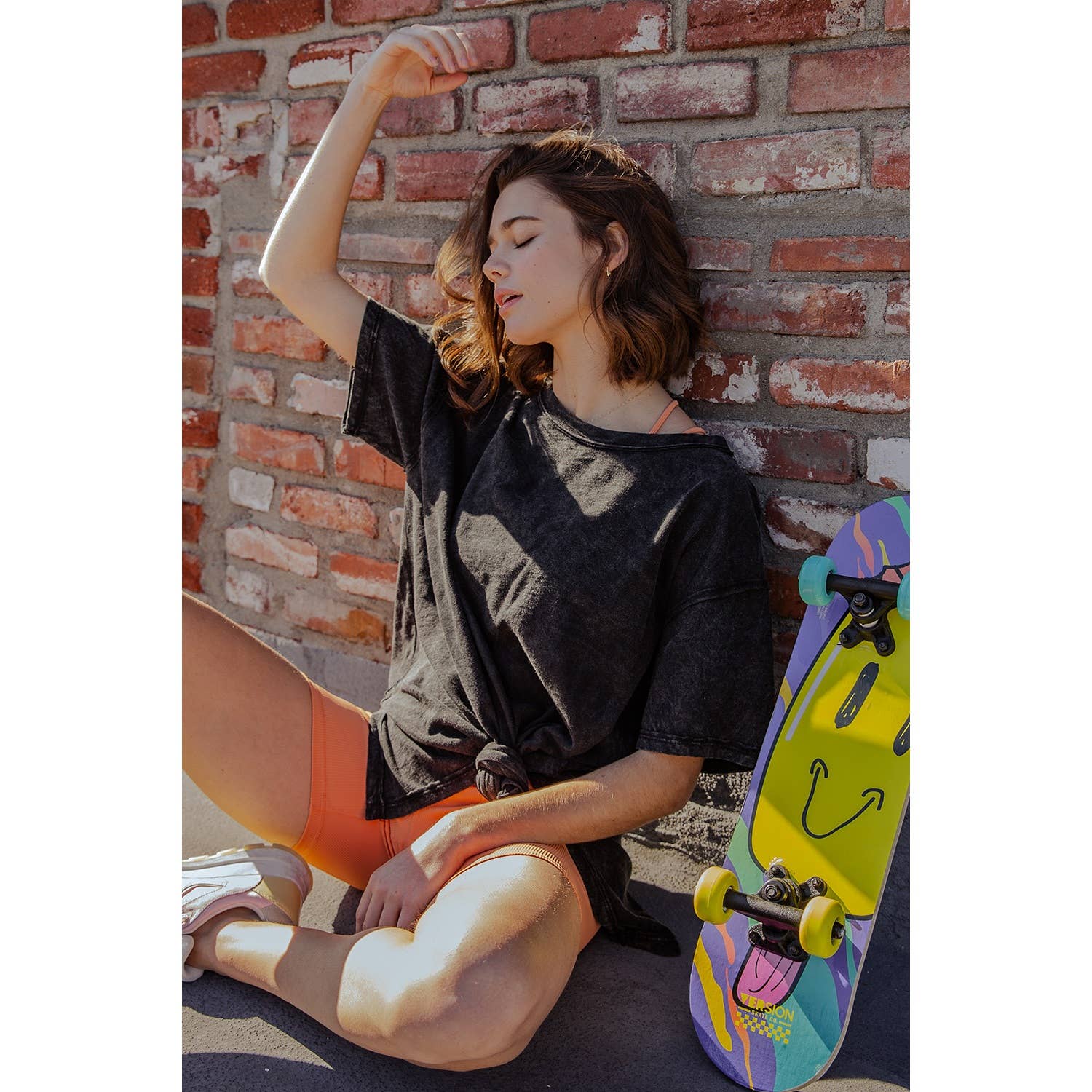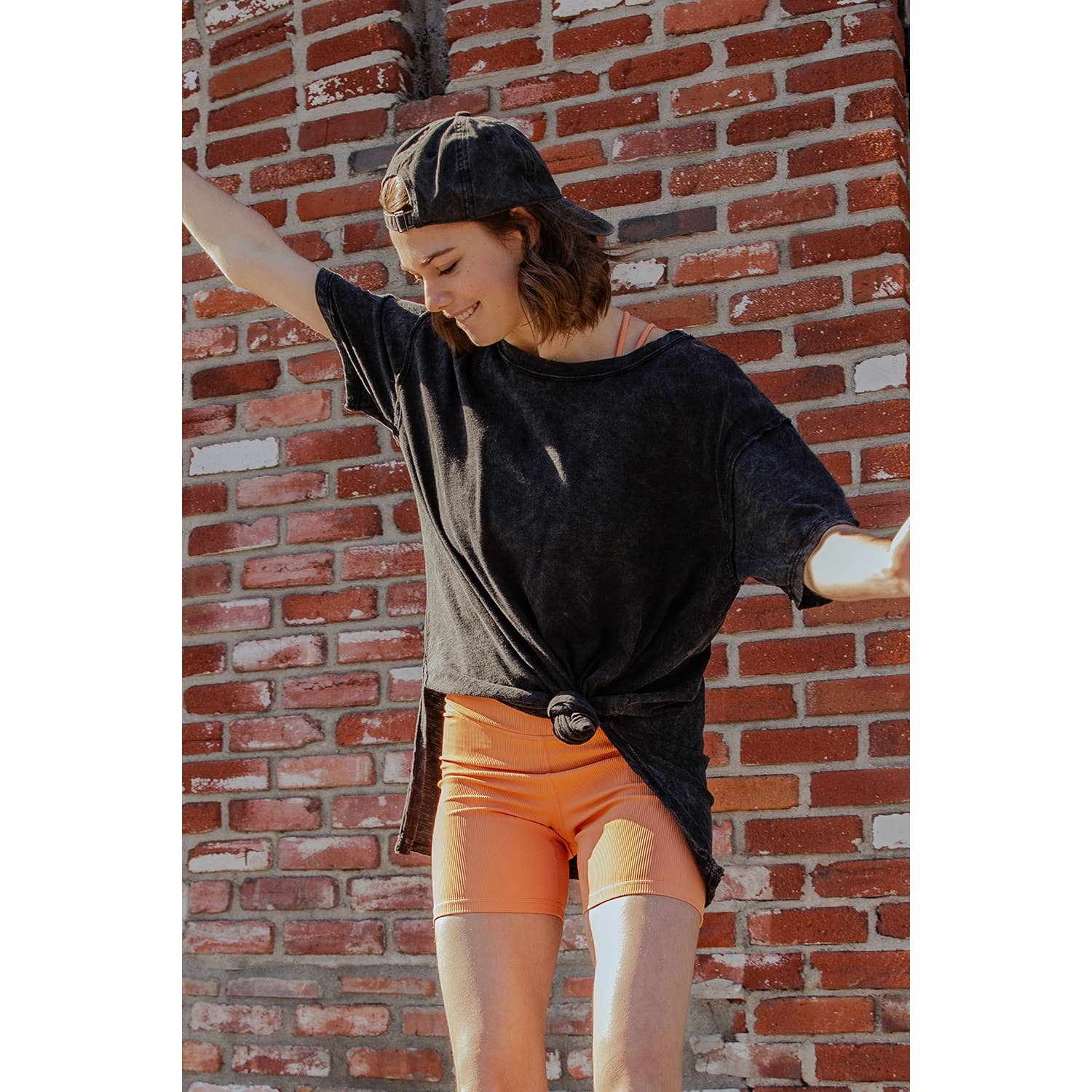 This playful short-sleeve top features a mineral washed finish and a comfy round neckline. It includes side slits for a fun twist. Our model, standing 5'9", is rocking a size Small. Made from a cozy blend of 60% cotton and 40% polyester.