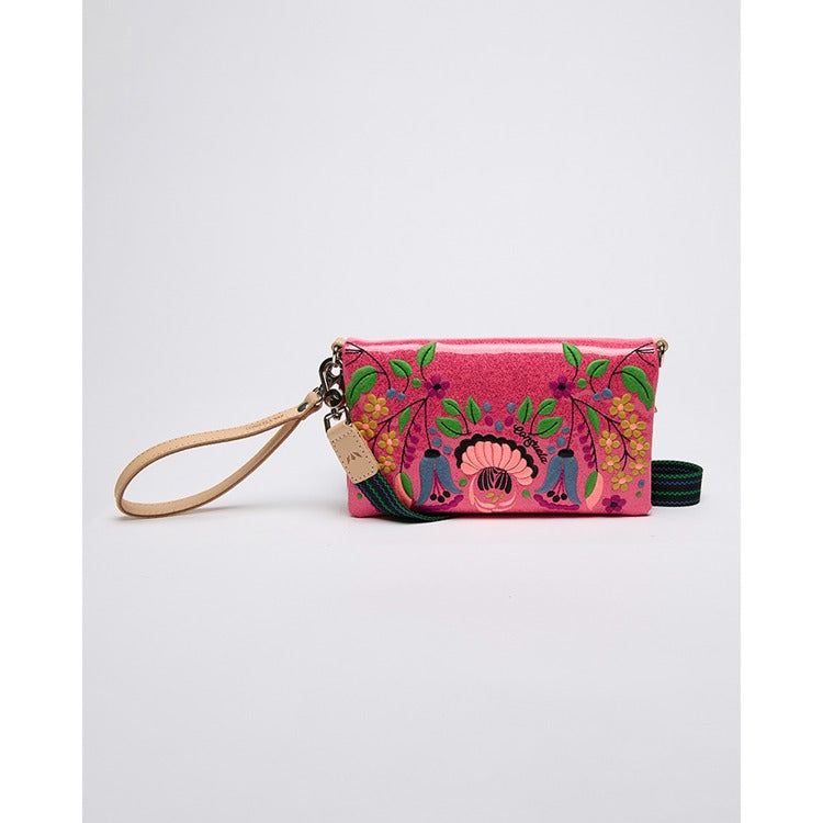 - Included detachable wristlet strap and adjustable woven crossbody strap