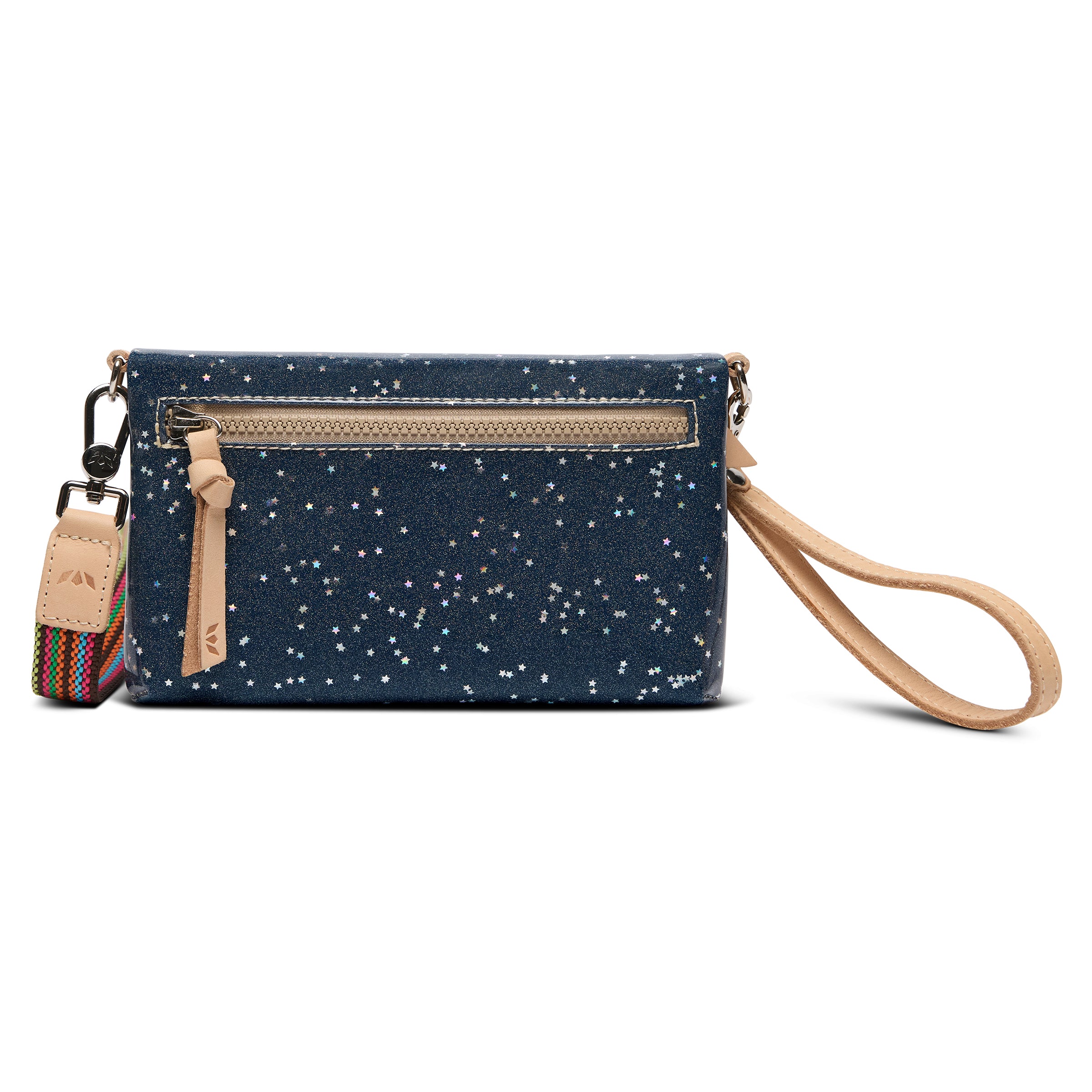- Included detachable wristlet strap and adjustable woven crossbody strap