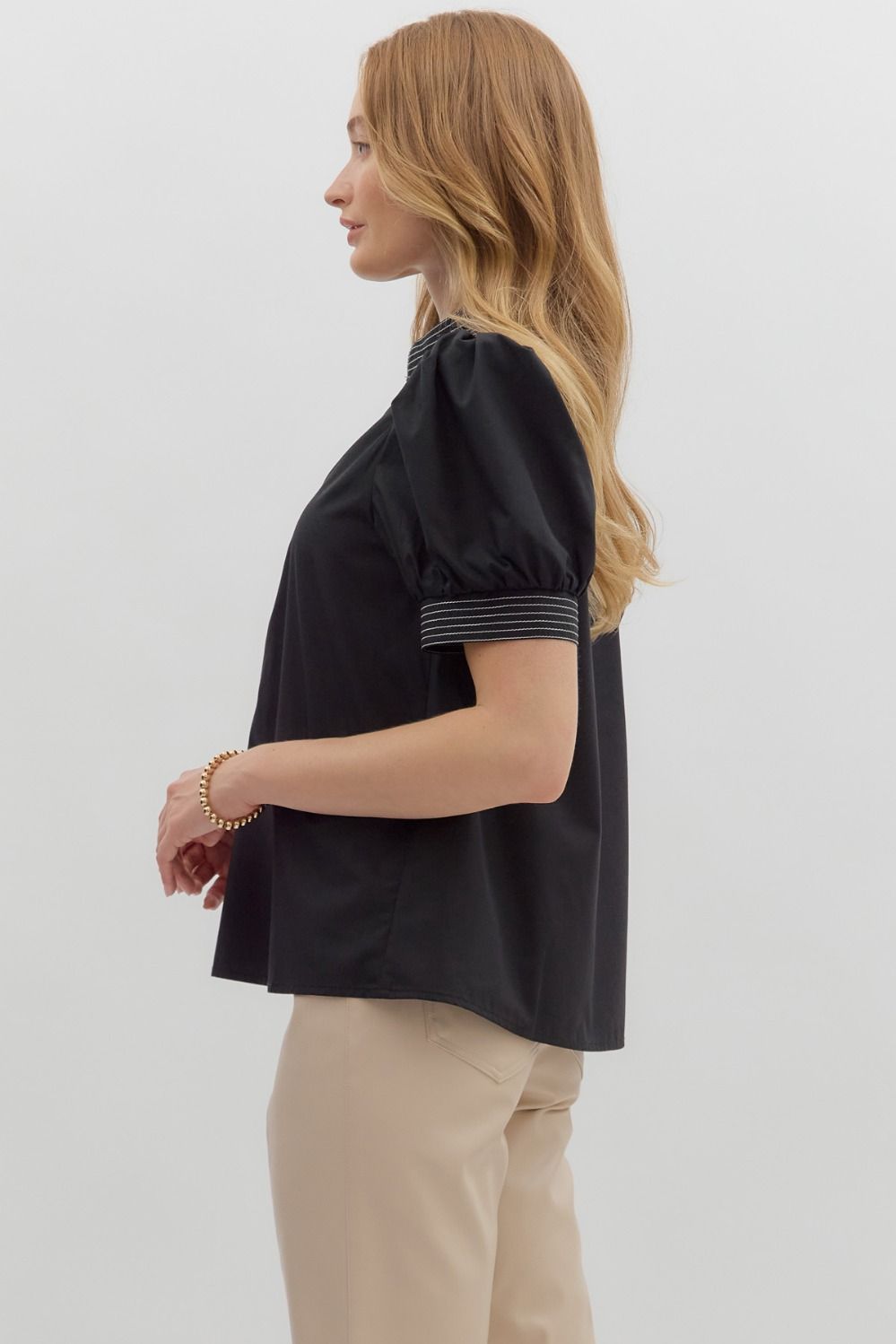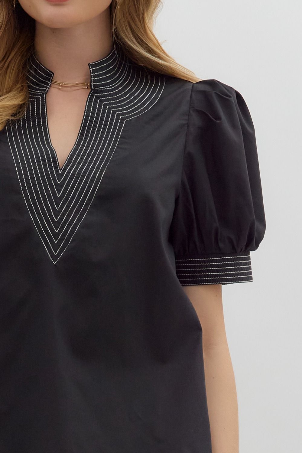 Solid short puff sleeve V-neck top featuring contrast accent stitch detailing. Unlined. Woven. Non-sheer. Lightweight.