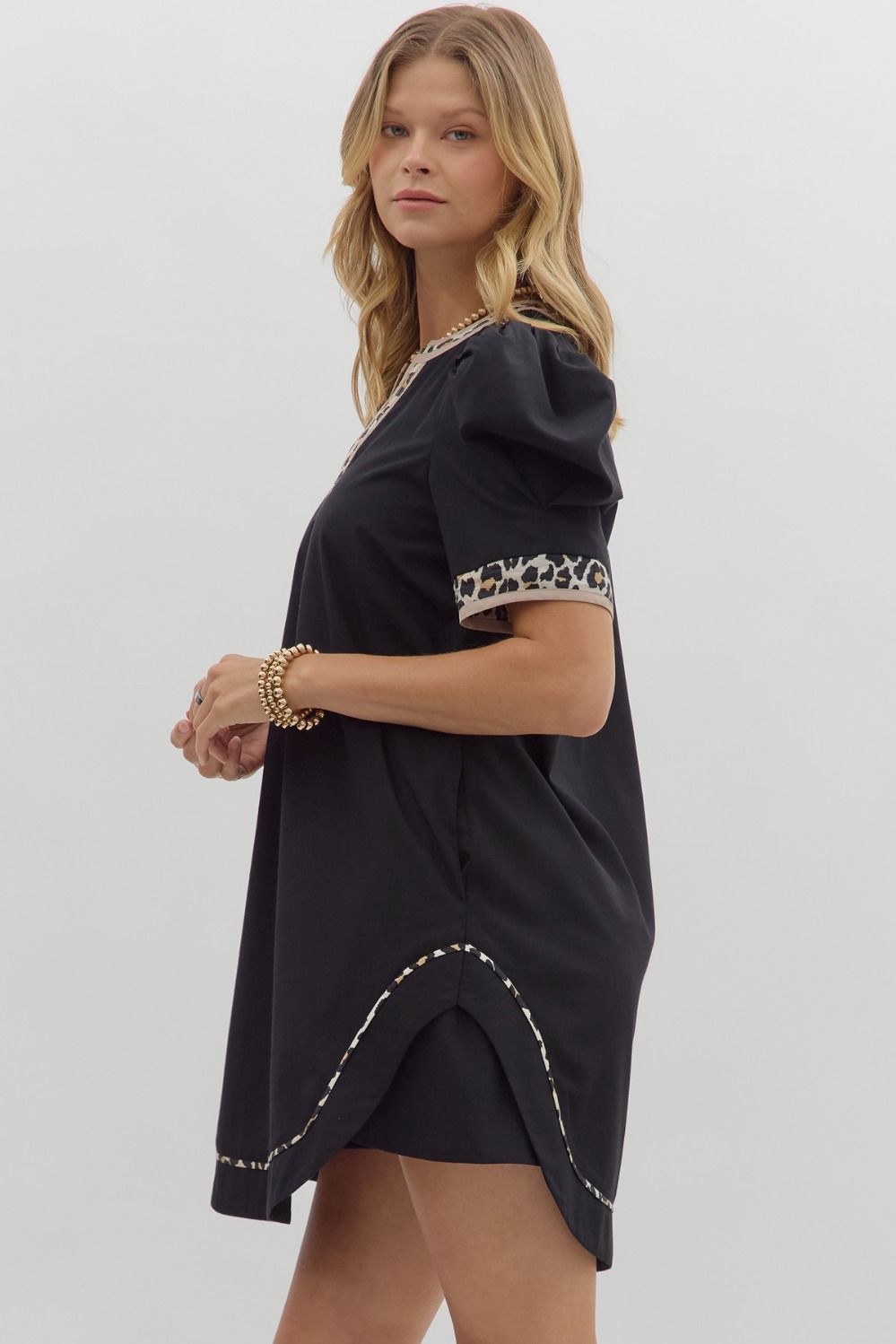 Solid pleated short puff sleeve mini dress featuring animal pattern contrast detail. Side Pockets. Lined. Woven. Non-sheer. Lightweight.