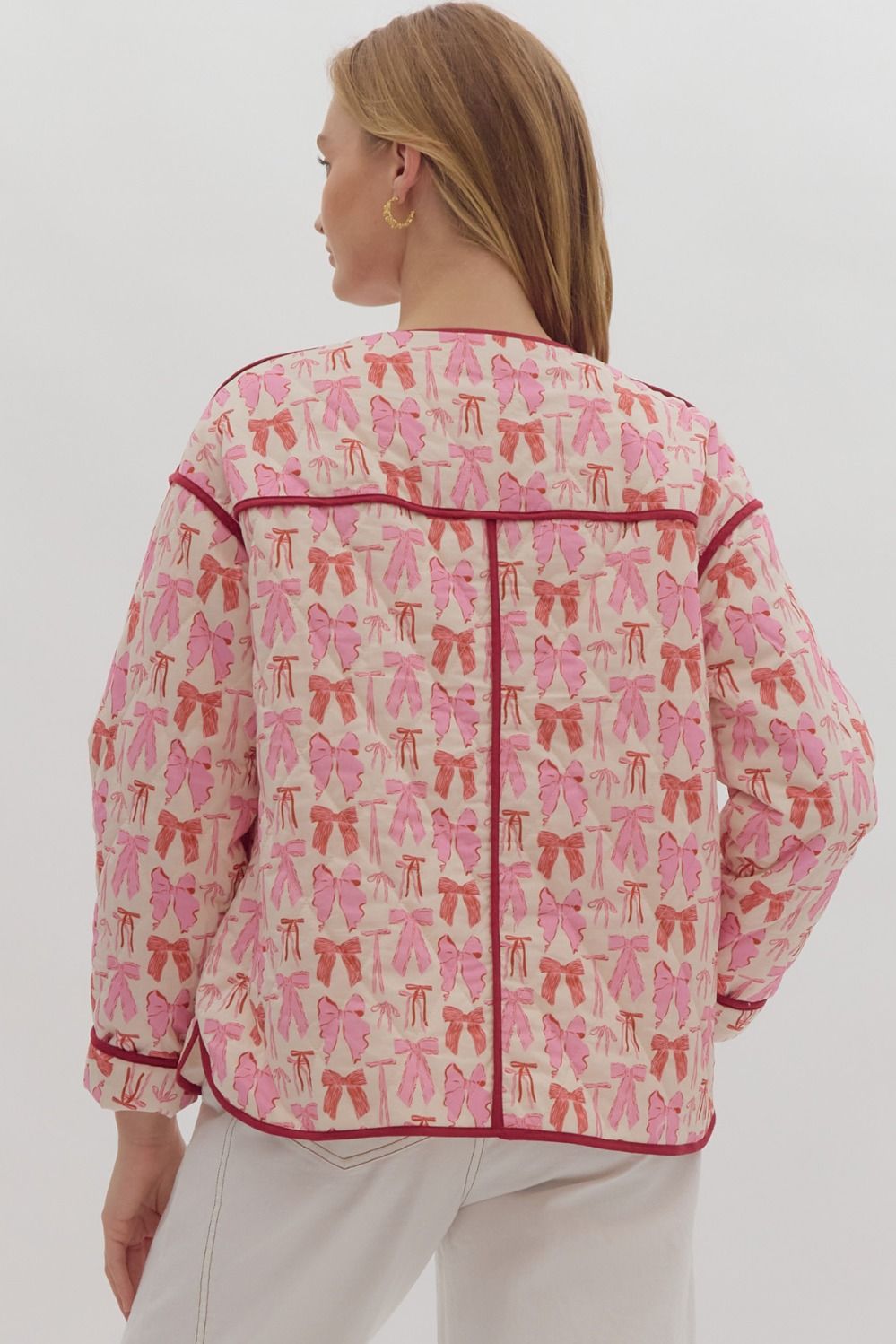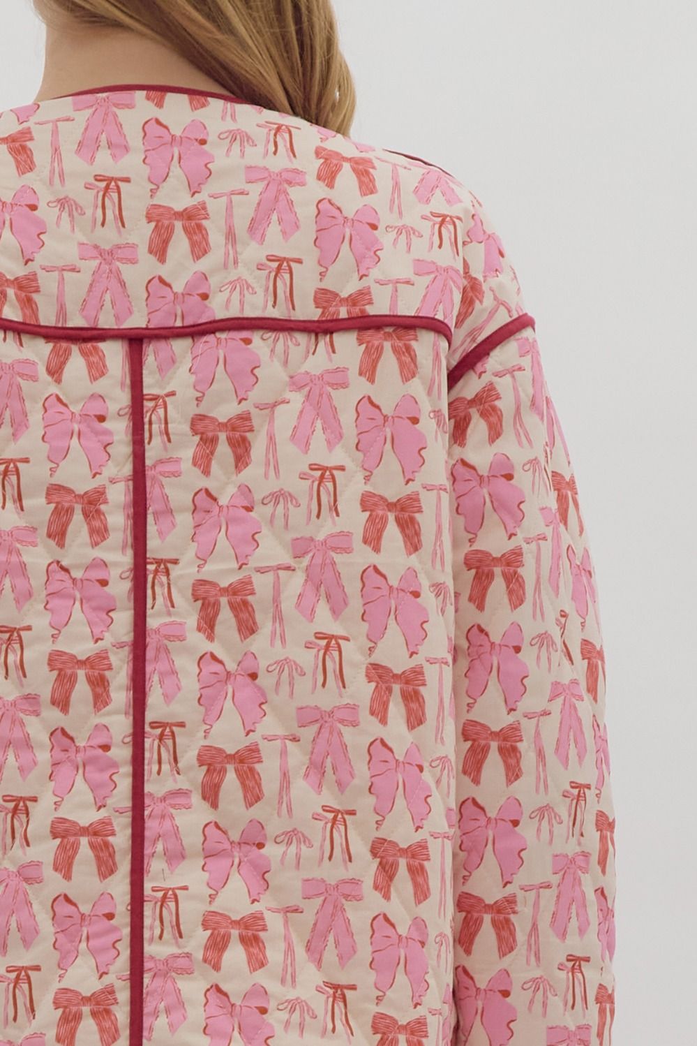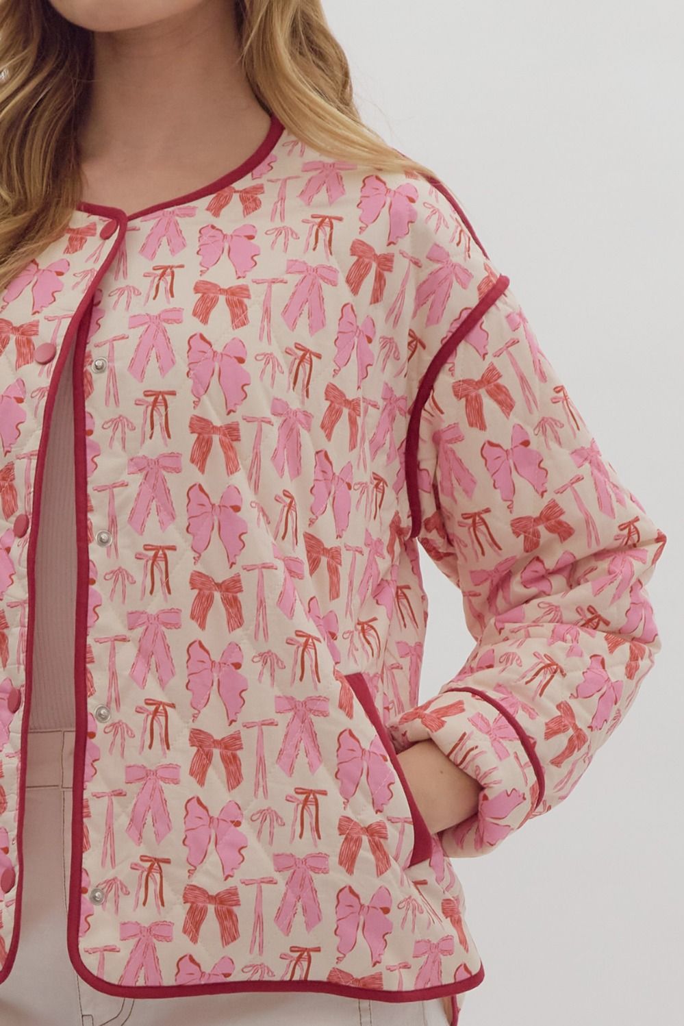 Bow print long sleeve snap button jacket featuring pockets at side. Unlined. Knit. Non-sheer. Lightweight.
