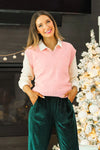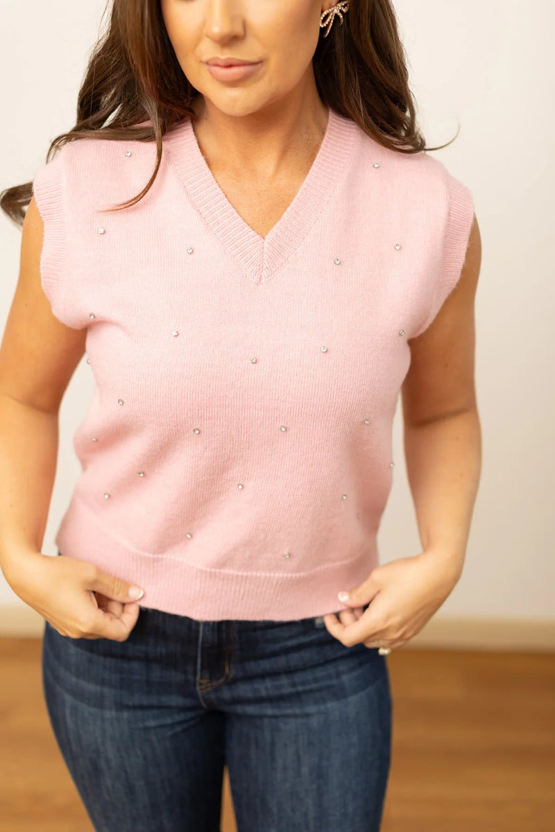 This vest sparkles with silver rhinestones against a soft pink fabric, offering a perfect blend of glamour and comfort. The high-stretch material ensures a flattering fit, while the V-neck and "Mom Crop" design add a trendy touch to your outfit. Ideal for layering over your favorite tops, this vest is a must-have for adding a pop of shine to your wardrobe. Pairs perfectly with The Kathryn White Button Down.