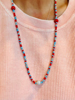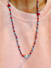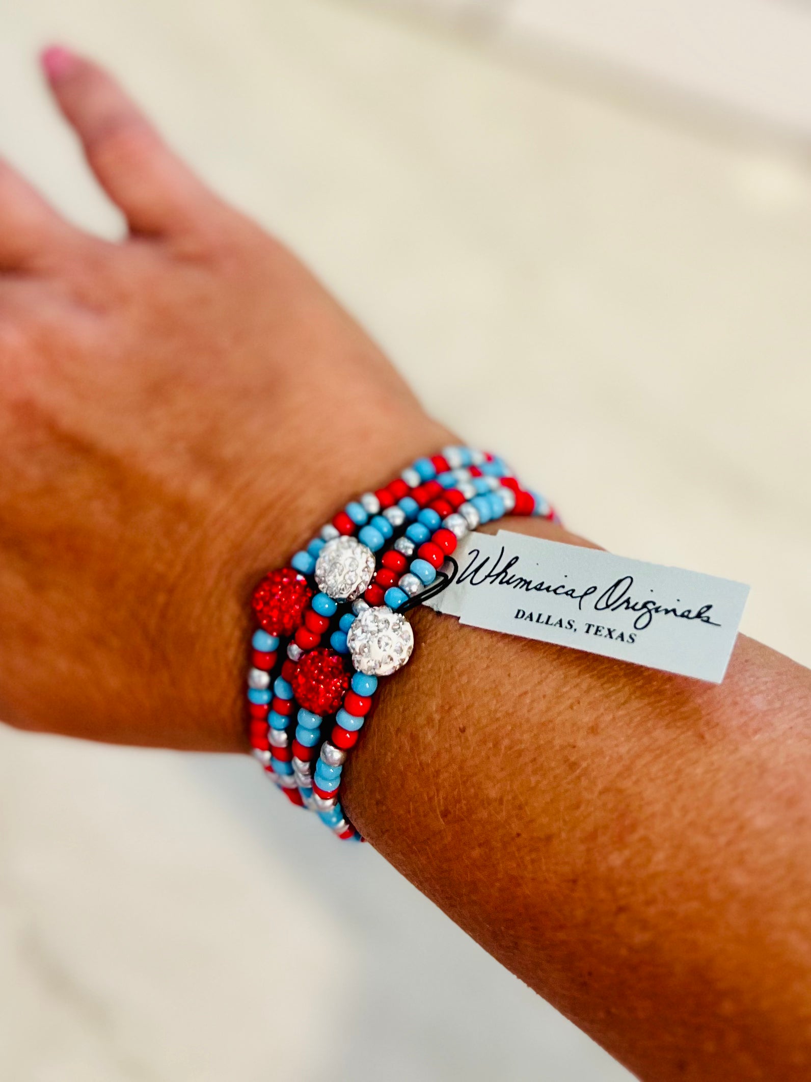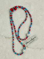 Custom made by Whimsical Originals in Dallas, Texas, this unique piece is made specifically for our Lumberton Raider fans. Hand strung Columbia blue, red, and silver and 4 scattered bling beads (2 red, 2 crystal) on a stretch band, can either be used as a necklace or wrapped around your wrist multiple times for a one of a kind bracelet stack.