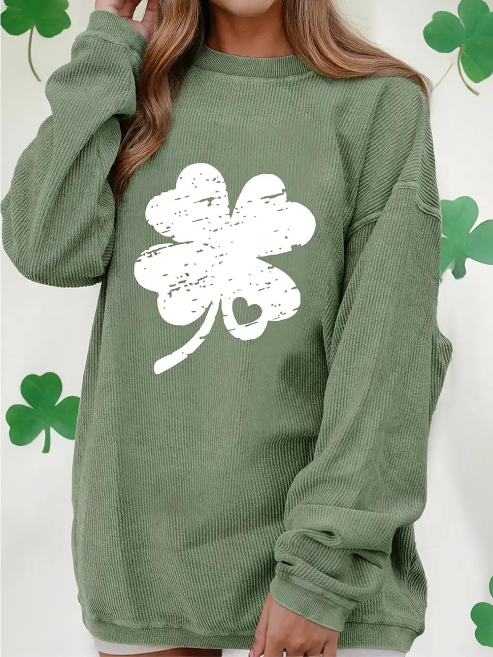 Celebrate St. Patrick’s Day in laid-back style with the Distressed Clover Print Corded Sweatshirt. This cozy top combines festive shamrock graphics with a comfortable, slightly worn-in feel, offering a cool and casual way to show your Irish spirit. Pair with jeans or leggings for a comfortable, festive casual look Layer over a collared shirt for a preppy, relaxed vibe Wear with denim shorts and sneakers for a St. Patrick’s Day outing Perfect for parties, parades, or adding a touch of luck to your everyday wardrobe
