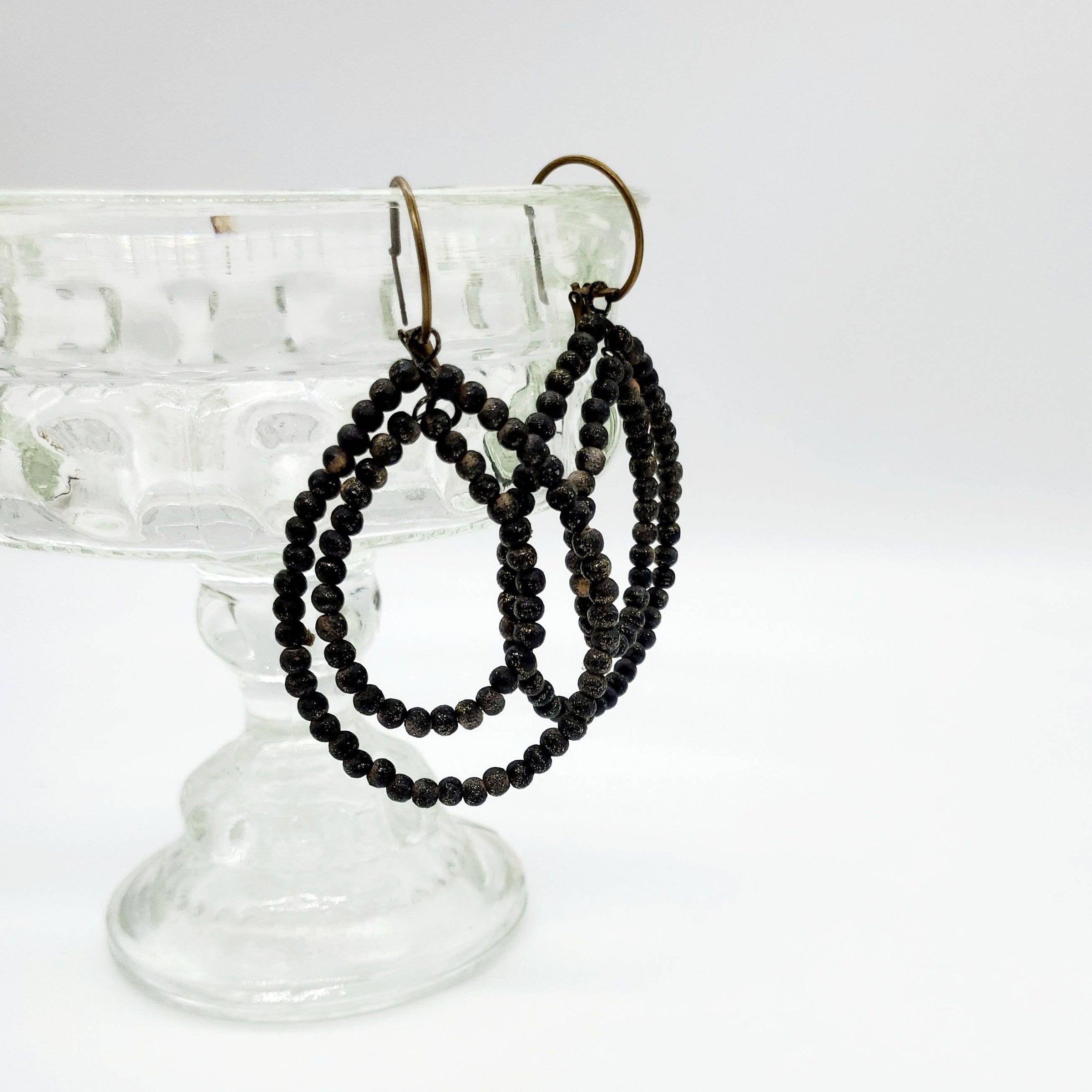 Gorgeous hand-dyed snake teakwood beads on a 2 1/2-inch earrings on 1/2-inch hoop. A top seller amongst our Retailers! Comes in a matching necklace and available in multiple colors. Every piece is uniquely made and one-of-a-kind. Please note actual shape, colors, etc. may vary from image. -