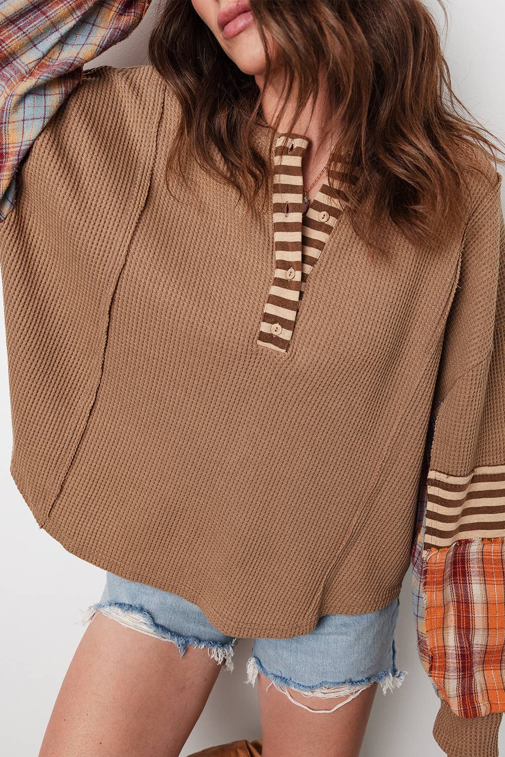 Waffle Stripe Plaid Patchwork Henley Knit Top
